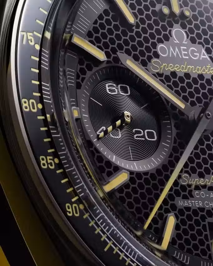 腕錶錶盤環繞有賽車風格的獨特分鐘圈,黑色陶瓷表圈上的標誌性測速刻度由全新的黃色「大明火」琺琅製成。這一大膽醒目的黃色同樣被用於漸變計時秒針、計時指針以及設於9點位的條紋小秒針上,旨在呼應誕生於2013年的海馬系列Aqua Terra >15』000高斯腕錶。60分鐘和 12小時計時盤設於3點位,也可用來指示第二時區。錶盤呈現「蜂巢」結構,靈感源自歐米茄博物館展示的一款可抵抗160,000高斯極端磁場的概念腕錶。