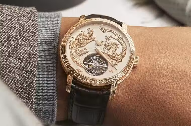 江詩丹頓之所以會選擇龍與鳳凰做為主題,是因為他們在傳統中國文化裡被認為地位崇高,象徵力與美的平衡、天下太平,也因為龍與鳳代表男性與女性,因此也有婚姻美滿的寓意,因此在手錶面盤放上龍鳳圖案讓人一看就覺得吉祥與喜氣,品牌不只精心選擇這種只在神話中出現的神獸為主題,還特別選用了超經典的龍鳳戲珠圖,這種圖案常見於中國傳統禮儀玉器、刺繡以及雕塑作品,洋溢陰陽和諧、四海昇平之意,呈現在面盤上既有搶眼的裝飾效果,又有很多美好的寓意,看起來超級賞心悅目。