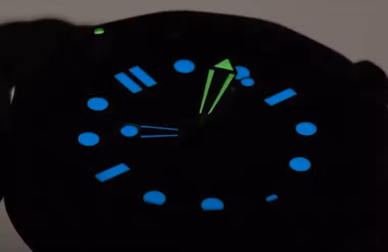 海馬潛水300米將日期窗設置在6點方向,可以和12點方向的歐米茄和超霸名稱互相呼應,看起來格局對稱而和諧;綠水鬼乃是將日期窗放在3點方向,但因為它多了小窗凸透鏡,所以視覺上的比例倒不像海馬潛水300米那種剛剛好的味道。此外海馬潛水300米錶圈上倒三角形指標以及分針的夜光效果為綠色、時針、秒針和時標的夜光效果為藍色,這點有助於佩戴者更清楚判讀時間。