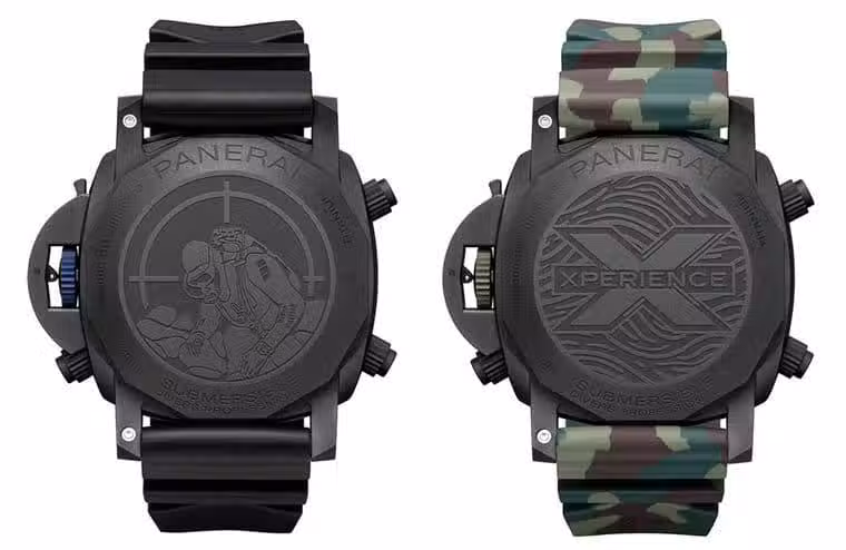 翻到錶背,兩款錶同樣都是採用黑色DLC鈦金屬實底蓋,不過PAM01239底蓋上鐫刻著一個Marina Militare 蛙人圖案、PAM01238則單刀直入地刻上代表體驗版的」X」標誌與」XPERIENCE」字樣,周圍還帶著不規則波浪紋路點綴。從手錶具備飛返與倒數計時功能可以推測它們搭載的是P.9100/R這枚自動機芯,除了功能上的亮點,這枚機芯以雙發條盒輸出3日動能也是令人稱道的一項優點。