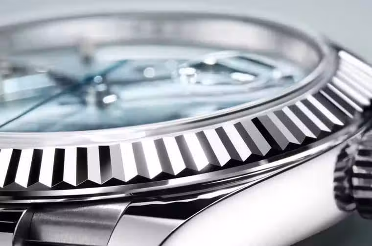 過往鉑金材質的Day-Date只有拋光錶圈和鑲鑽錶圈兩種設計,但或許是因為拋光錶圈給人比較鮮明的「入門」印象,因為這種加工比起鑲鑽或是三角坑紋,於製作難度方面相對較低,因此放在身為Day-Date系列旗艦款的鉑金版身上多少讓人感到有點反差。到了2022年勞力士決定統一把鉑金款總統錶的錶圈也改為系列主流的三角坑紋錶圈,光就外型看起來,三角坑紋錶圈的裝飾效果更強烈,搭配鉑金材質製作更顯工藝難度,這讓鉑金Day-Date彷彿終於蛻變成完全體般,讓人不會再因為手錶配置的是光滑的錶圈設計而覺得好像少了點什麼似的。
