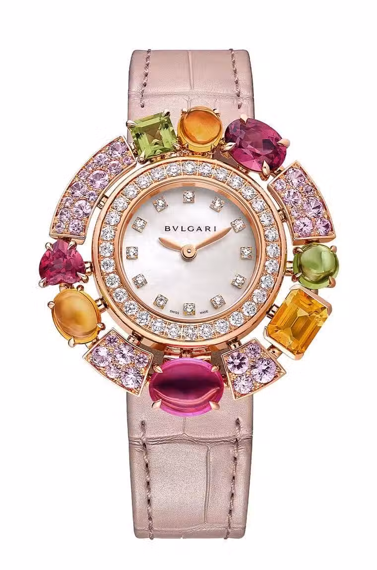 玫瑰金材質/石英機芯/時、分顯示/錶殼鑲圓形明亮切割鑽石32顆、粉紅剛玉32顆、橢圓形蛋面切割粉紅碧璽1顆、蛋面切割與祖母綠切割黃水晶3顆、心形與橢圓形切割粉紅玫瑰石榴石2顆、蛋面切割與祖母綠切割橄欖石2顆/面盤鑲圓形明亮切割鑽石12顆/錶扣鑲圓形明亮切割鑽石8顆/藍寶石水晶鏡面/錶徑36mm/參考價:NT$ 870,000
