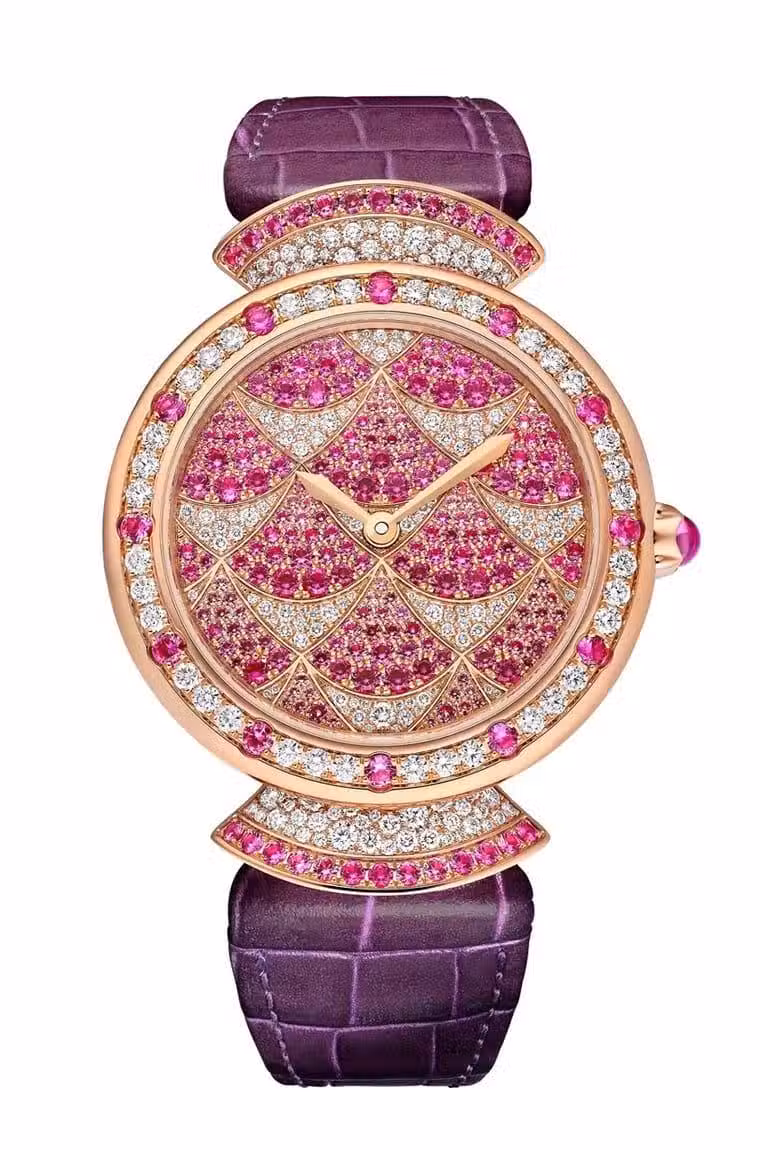 玫瑰金材質/BVL191自動上鍊機芯/時、分顯示/錶款鑲鑽約重3.8克拉、粉紅剛玉約重3.5克拉/藍寶石水晶鏡面、透明底蓋/防水30米/錶徑37mm/參考價:NT$ 2,564,000
