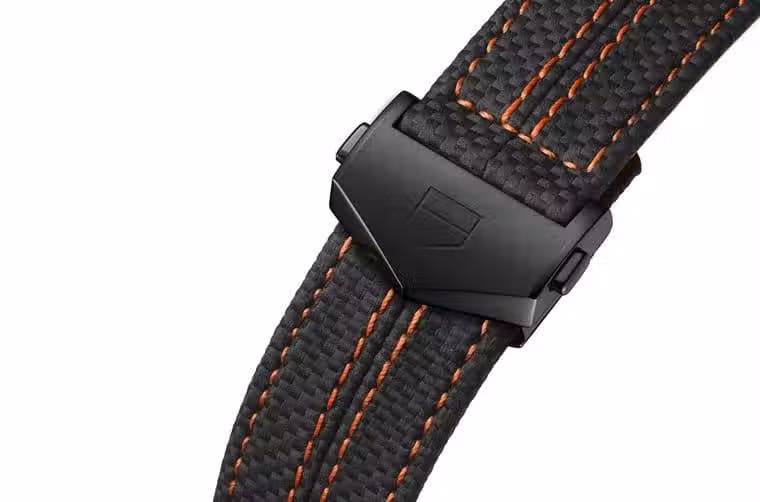 ▲黑色壓紋皮錶帶的兩色縫線與襯裡同為橘色,搶眼的配色組合充滿濃濃的賽車氛圍。