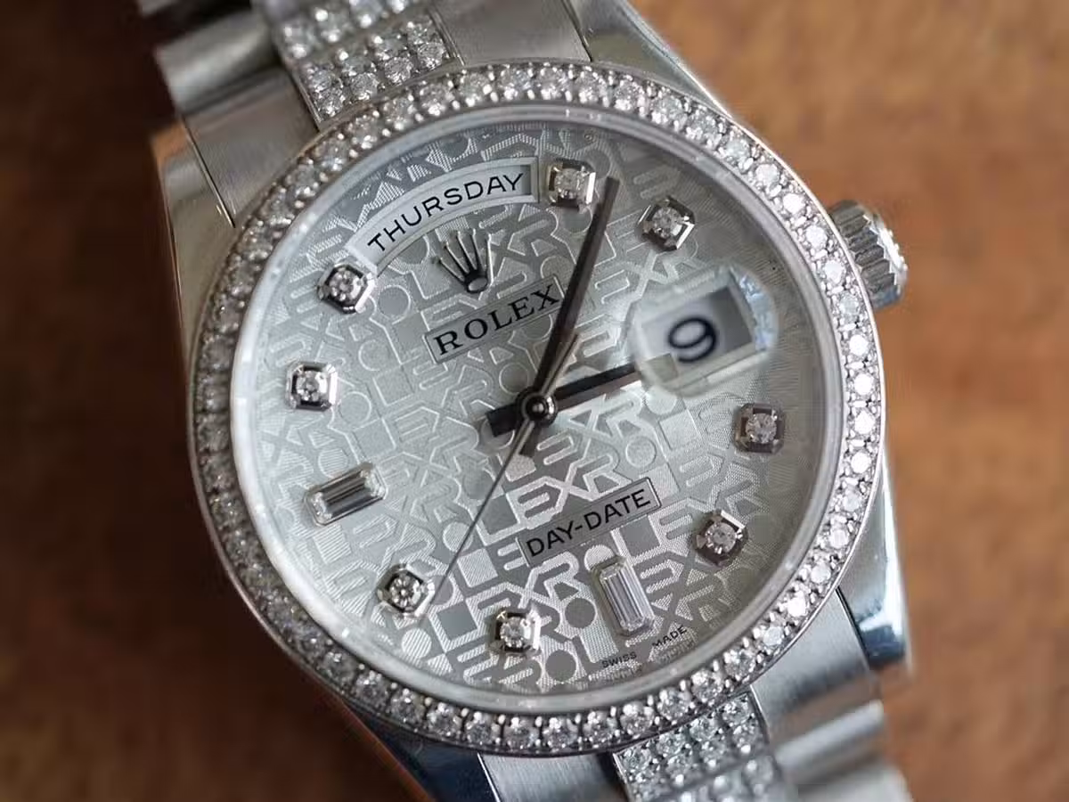可以看到整表的鉆石都是小方鉆,尺寸分三種,盤面最大再到外圈最小的表帶上的,多少顆就沒有具體去細數的了,勞力士的鉆石鑲嵌一直保持的不錯,無論是鉆石的品質和鑲嵌工藝上,最常見的盤面也有看出一二,千禧年開始有了大尺寸貴金屬底座後更是將鉆石完美的凸顯(俗稱大包鉆),雖然碎鉆(碎鉆指的是小於0.25克拉的小鉆)不值錢,材料價都不高,但放在腕錶里就是天花板。