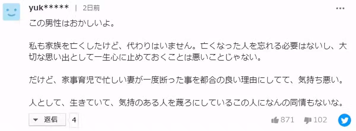 「這個男的,好奇葩啊。我也經歷過家人去世,但不會去找替代品。倒不是要忘掉逝者,懷念留在心裡並不是壞事。但是,這個男的以疲憊的妻子曾拒絕過一次性生活為由,從此都不配合,真的好噁心。」