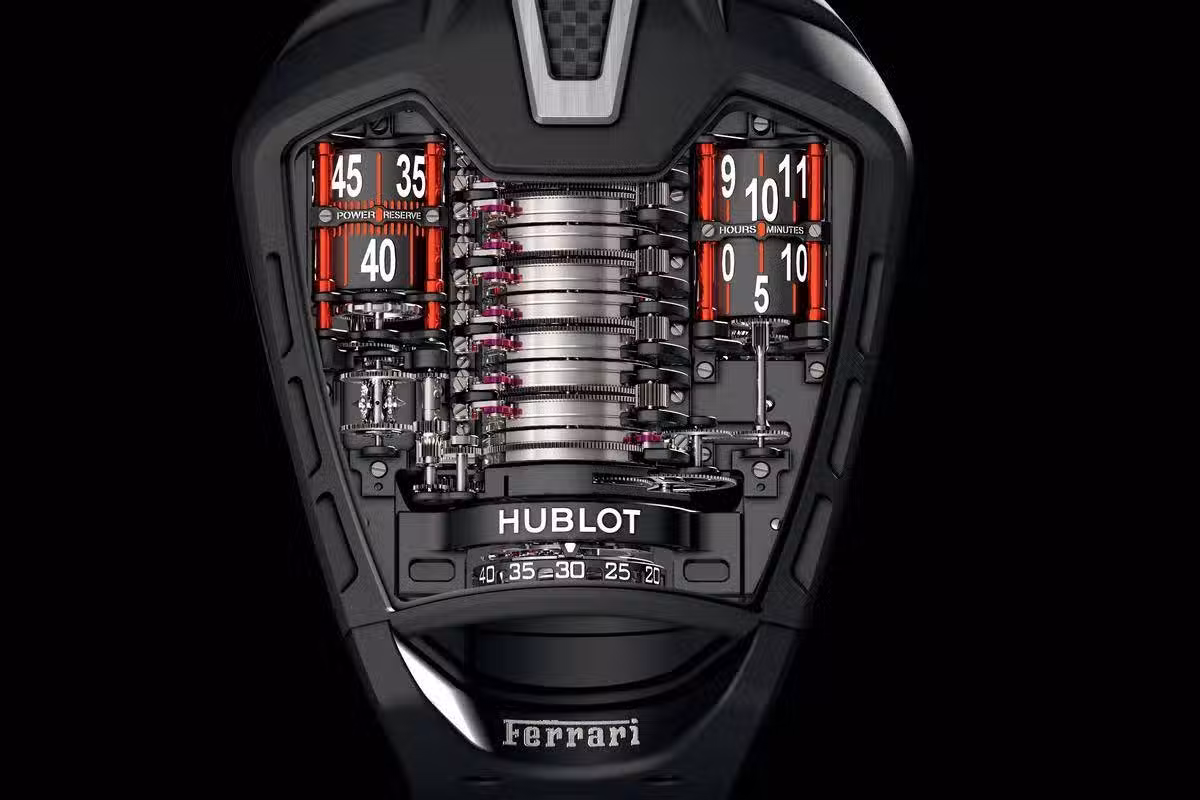 如此大的功率需要宇舶表將11個主發條盒一個接一個地堆疊起來。棘手的部分是設計一個系統,讓它們能夠緩慢而持續地放鬆,從而使手錶保持準確。時間顯示在表盤右側的移動鼓上,左側是動力儲存指示器,可讓佩戴者知道何時為機芯上弦。宇舶忍不住在腕錶中放置了一個陀飛輪——陀飛輪通過表殼下部水平顯示在一疊發條的底部,MP-05法拉利限量生產50件。