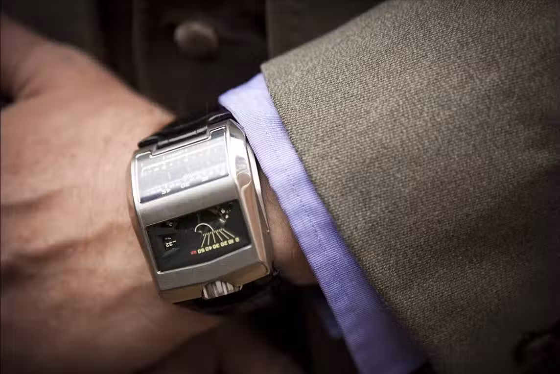 UR-CC1手錶擁有「眼鏡王蛇」的別名,原因無他,沃爾克喜歡在他們的每款新作品中添加可怕的動物的名字。更好地思考這款狂野手錶的方式是理解其目標是顯示小時、分鐘和秒,每一個都在線性(而不是圓形)顯示上。