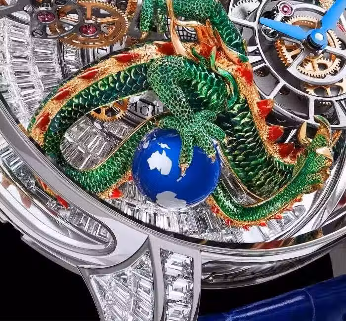 天文藝術綠龍手錶18K 白金表殼直徑為 50 毫米,厚度為 25 毫米,介於其特殊弧形正面藍寶石水晶的最高點和表殼的最低點之間。表殼四周安裝了四個藍寶石水晶窗,可以暢通無阻地觀察內部的機芯和藝術品。表殼底部鋪鑲 202 顆隱形鑲嵌長方形白鉆(約 8.37 克拉)。表耳上覆蓋著 80 顆隱形鑲嵌長方形白鉆(約 6.10 克拉)。