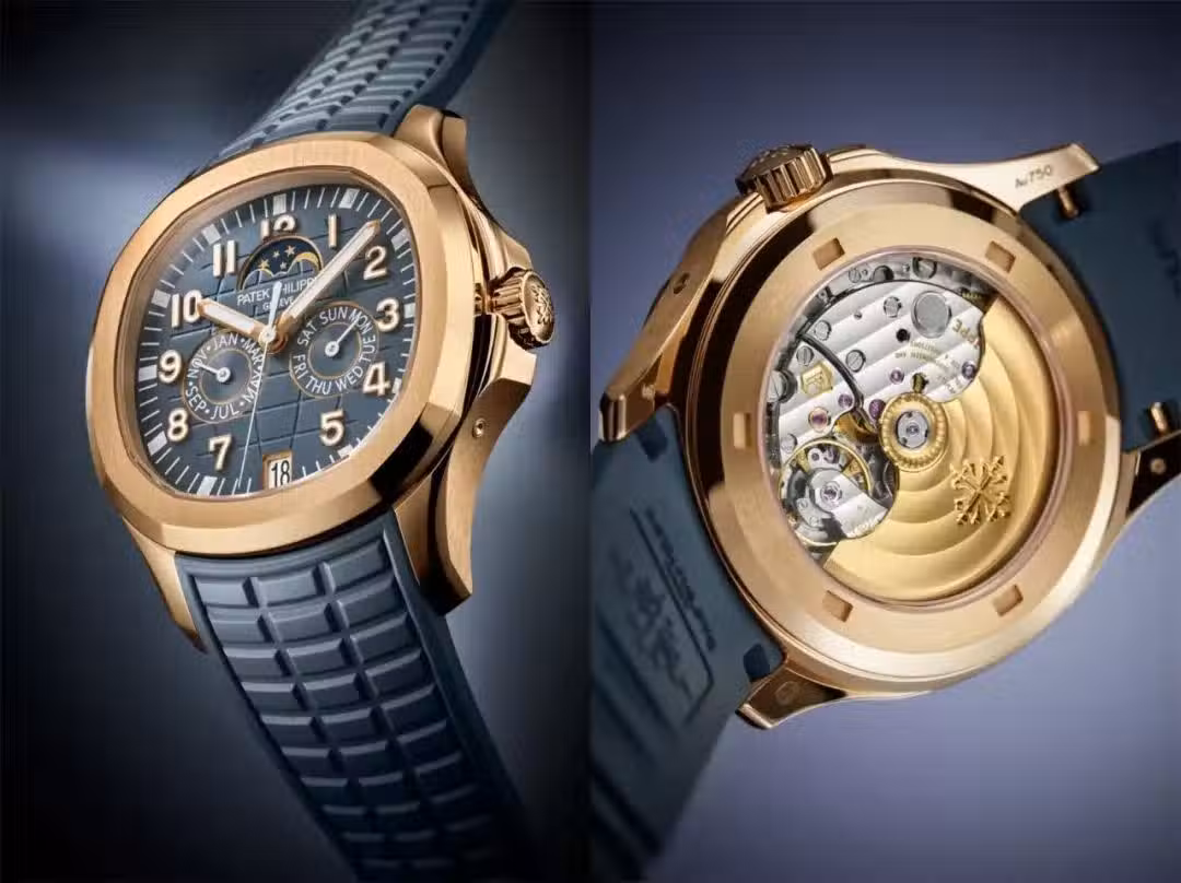 18K玫瑰金表殼,表徑39.9毫米,藍灰色面盤綴以 Aquanaut 凸紋圖案,時、分、中心大秒針、日期星期月份年曆顯示、月相,26-330 S QA LU自動上鏈機心,動力儲能35~45小時,21K金擺陀,Gyromax®擺輪,Spiromax®遊絲,藍寶石水晶玻璃鏡面及底蓋,防水30米,藍灰色復合物料錶帶附18K玫瑰金百達翡麗專利摺疊扣,售價約合人民幣41萬元。