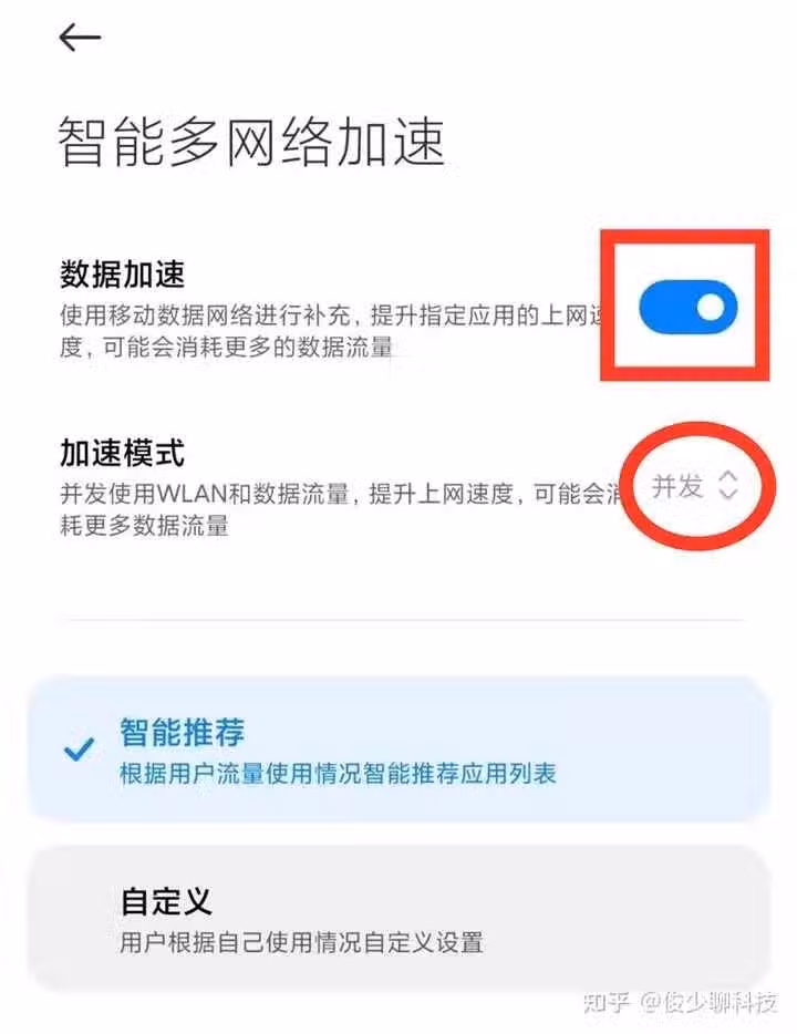 那麼除此之外呢,我們在使用手機的時候,常常會發現手機網絡並沒有斷開,但是呢看電視或者發消息的時候,會出現延遲,以及無法加載的情況,那麼這個時候,我們就需要對這些應用進行智能網絡加速,此時我們點擊下面的智能多網絡加速開關