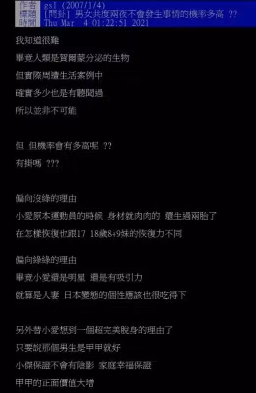 對此,有網友就好奇提問,如果男女過夜,不發生事情的機率有多大呢?