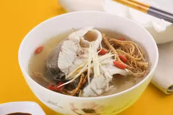2.取一湯鍋,放入鱸魚,枸杞及熱高湯5杯,先覆膠膜再蓋鍋蓋,以強微波10分鐘烹煮後,加入鹽、酒調味即可。