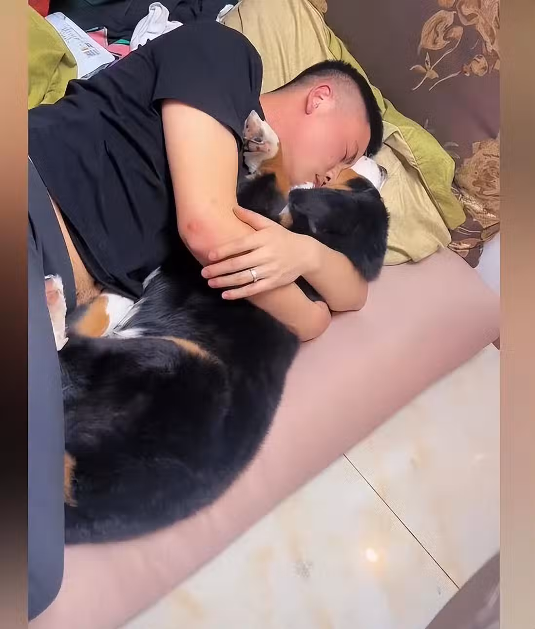 原來丈夫喝得是酩酊大醉,直接就躺在沙發上給睡著了,但這不是重點,重點是他的懷裡竟然緊緊的抱著狗狗不撒手。