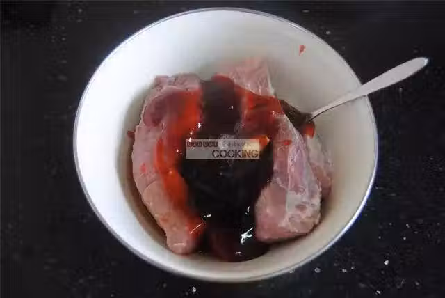 2,將蜂蜜以外的所有材料通通倒入肉里,叉燒醬我用過兩種,都是比較廣式偏甜的那種。一個是x天的,價格實惠,幾塊錢一瓶,口味也是我喜歡的,顏色做出來會比較暗,這裡用的是李x記,價格稍貴,香味也足,但顏色會比較淡,您要買的時候根據自己的喜好來選就好。
