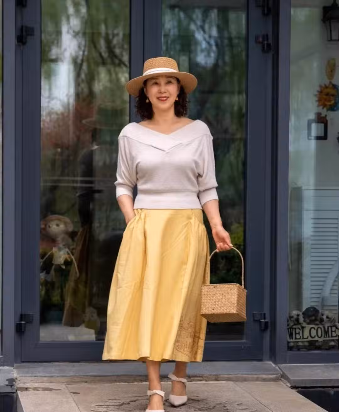 不要讓年齡約束自己的選款,春日的氛圍明快,又帶有一點活潑的基調,可以利用黃色半裙,形成優雅又具備活力的畫面。