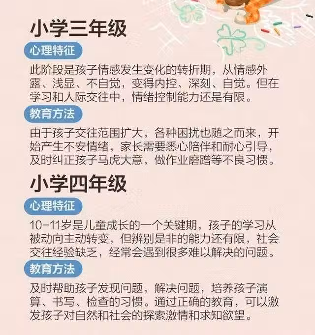 小學三年級到小學四年級,孩子在不同階段不同心理特徵和養育方法,供父母們參考。
