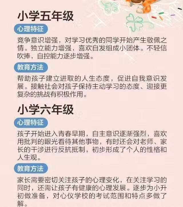 小學五年級到小學六年級,孩子在不同階段不同心理特徵和養育方法,供父母們參考。
