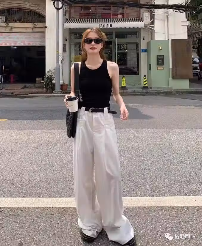 夏天就是要穿得隨意一點,這一套走的就是極簡高級風,灰色+白色+黑色的配色組合,顏色的搭配上比較乾淨大氣,挺有設計感的灰色背心,選擇一條白色直筒長褲,在這麼一條褲子的襯托下,腿部線條襯托得很筆直修長,試著將腰線比例給提高起來,這樣更顯利落感,小個子女生也適合喲~