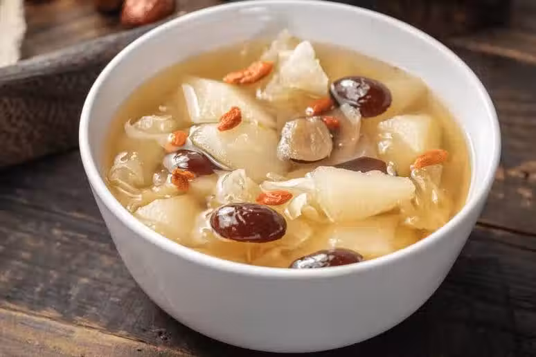 4、 拿一把勺子,在鍋子裡不停攪動,快速轉圈,不一會兒的功夫就出膠了,又快又多,這是第2個訣竅。攪動好以後,把紅棗、桂圓、冰糖放進去,接著再煮一段時間,大概20分鐘就行,看到裡面的湯羹,非常黏稠之後,就代表可以了。最後把洗好的枸杞,加入進去,再煮1分鐘,就可以出鍋啦。
