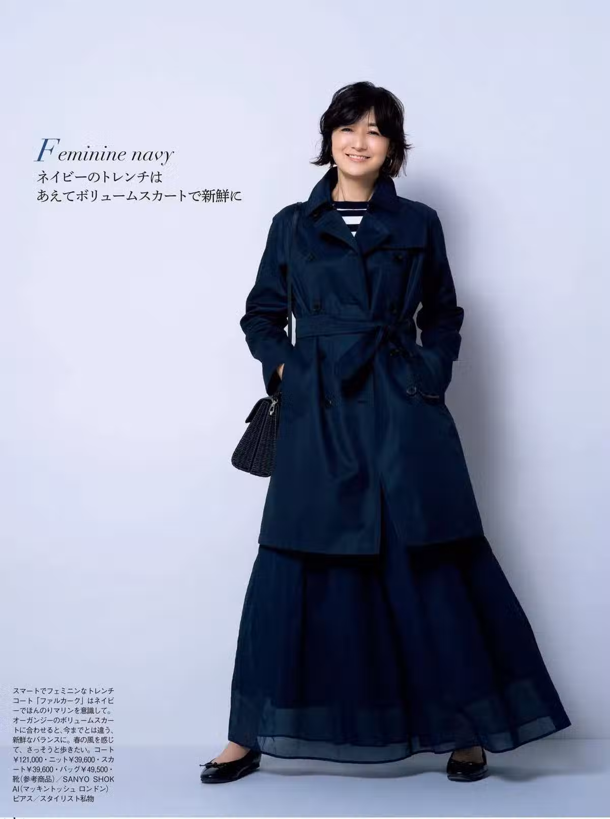 五十多歲的富岡佳子,選擇了一襲波點樣式的藍色襯衫裙,就能表達出一種法式優雅的風情,而看起來就特別簡約的短發,增強了她自身的灑脫感,裙裝的加入,又摻雜著一些些端莊的格調,給予女性更為好的氣質。