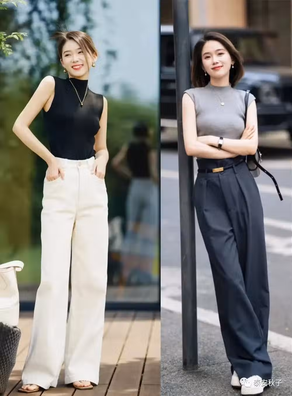 將其與修身無袖小衫搭配,再利用腰帶、與「賽衣角」的手法進行加持,進一步的去突出腰線,就可以很好的達到顯高、顯瘦的效果。