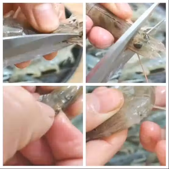 2、 此時能夠看到蝦頭的部位有一個黑色的東西就是蝦的胃,用手直接輕輕地將其摘除掉,下面連著的就是肝臟一起都處理掉了。