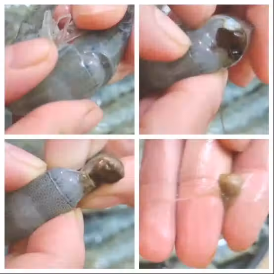 3、 此時能夠看到蝦的味,然後我們拿手輕輕一擠,蝦胃就直接出來了,會連著下線,直接就能夠扯出來,蝦線處理得乾乾凈凈。