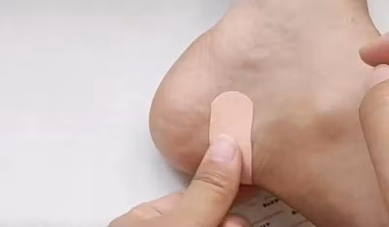 我們可以撕下一個創可貼粘在鞋子磨腳的位置,比如說這里磨腳,我們就粘在這個位置,這樣我們再穿鞋子的時候就不會磨腳了。
