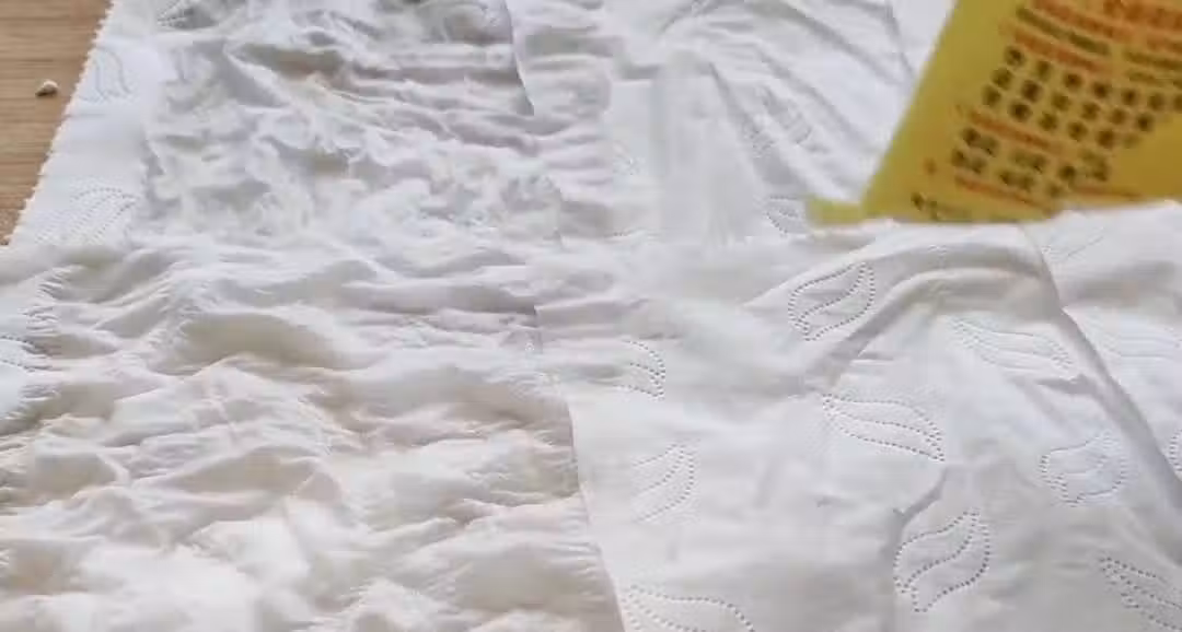 再倒上白醋,白醋里邊含有醋酸,可以軟化污垢,鋪上衛生紙是為了讓白醋更好的吸進這個暗白的縫隙里邊,更加容易清潔。白醋遇到小蘇打之後會發生反應,這個時候可以更好的把我們的案板清潔干凈,靜置十分鐘。