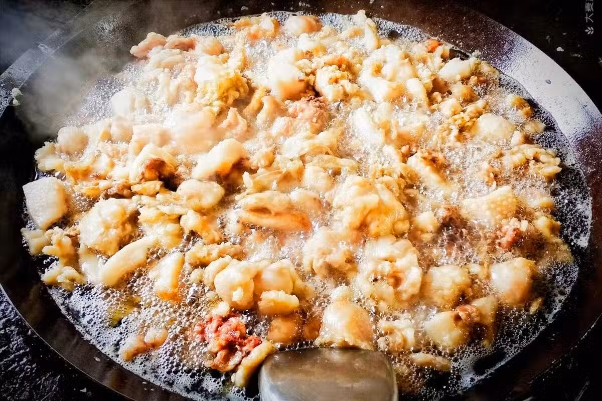 步驟三,等豬板油,或者豬肥膘裡面的油脂,全部熬制出來以後,它就會變得焦黃,變成酥脆的豬油渣了。豬油渣也不需要扔掉,很多人就好這一口,撒上椒鹽、辣椒麵等直接吃也好吃,或者炒菜的時候放進去,味道也不錯。