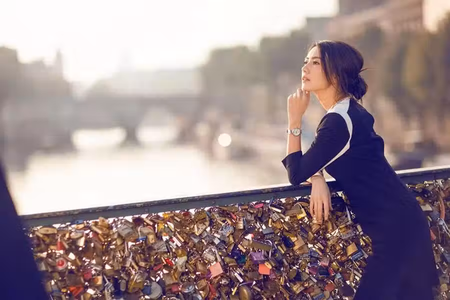 一些旅行場地,都有一些欄桿,比如海邊、江邊、路邊,都可以讓自己像下面的女士一樣,靠在欄桿上,然後眼神自然的看著遠方,抬手托下下巴都可以,自然愜意舒服又有意境。