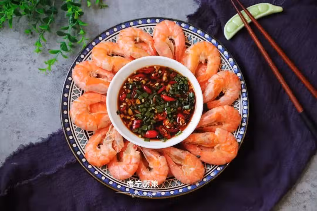 第六步:把蝦從涼水中撈出瀝干水分,放在一個漂亮的盤子裡擺盤,蘸料放在盤子正中間即可上桌。
