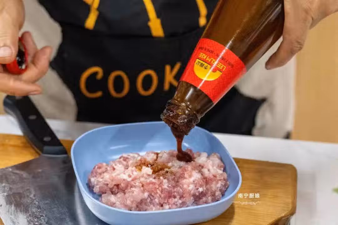 2.豬肉洗干凈剁成肉末,裝入碗里,加入料酒、生粉、鹽、生抽、蠔油,用筷子攪勻腌制15分鐘。