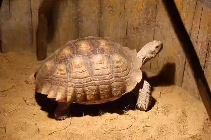 蘇卡達陸龜背甲黃褐,幼體紅褐;前緣中央具缺刻,沒有頸盾,後緣鋸齒狀;腹甲淡黃,後緣缺刻較深;四肢圓柱形,具較大圓錐狀硬脊;前肢5爪,後肢4爪;尾短,淡黃色。 其外觀與豹紋龜相似,但甲殼上並沒有花俏的紋飾,幾乎是接近單純的亮棕色(包括整個頭部四肢及腹甲)。喉甲突出,某些雄性成體在前面及後面的緣盾會明顯捲曲,大腿後側有數枚圓錐形的粒狀鱗片。