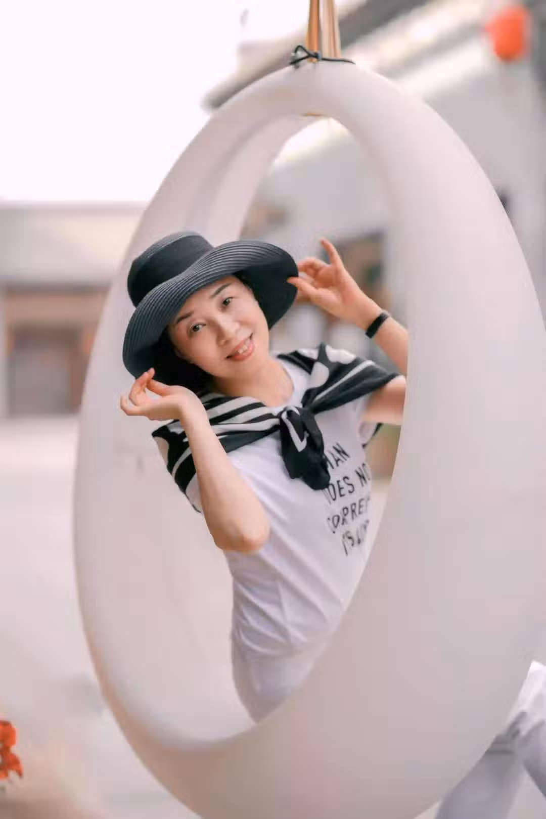 不論您是穿著裙裝還是褲子拍攝,在拍坐姿時都可以翹個二郎腿,像下面的女士一般,自然坐下,雙腿交叉,雙手自然放在腿上,再將目光看向遠處,輕輕鬆松拍出知性美和優雅感。