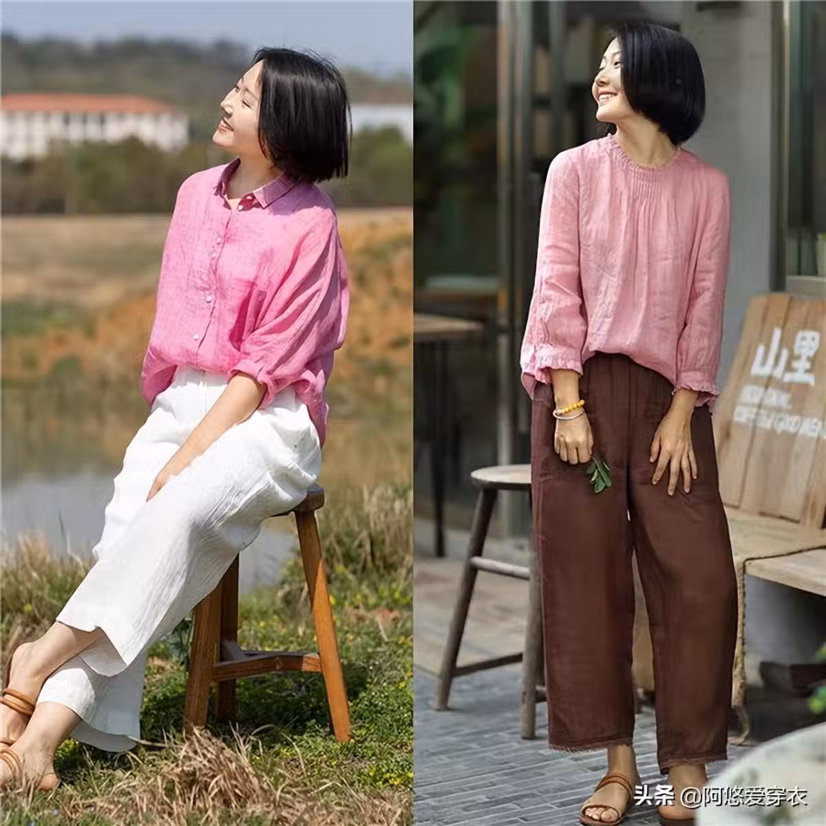 和那些暗沉的大地色相比,粉色的減齡效果毋庸置疑,就像下面左邊這種棕色大地色的穿搭會有些許單調,而右邊的粉色服裝則能夠改善整體的氣質,即便下半身搭配黑色也並沒有那種沉悶感,反而能夠藉助深淺結合的配色展現穿搭層次。
