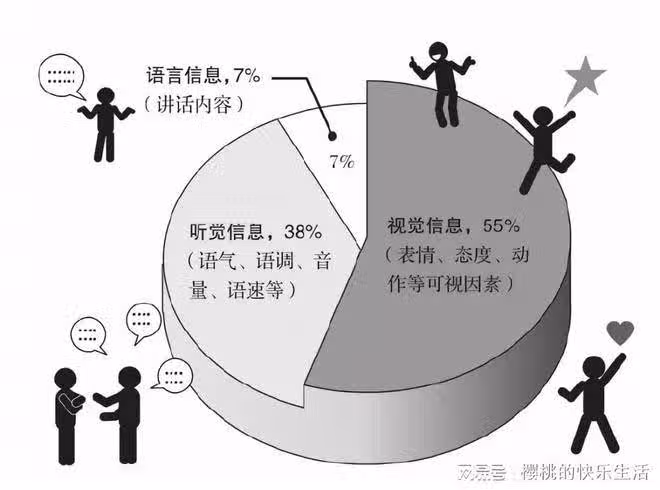 55%是通過看,比如我們的手勢、表情、態度、肢體語言等;