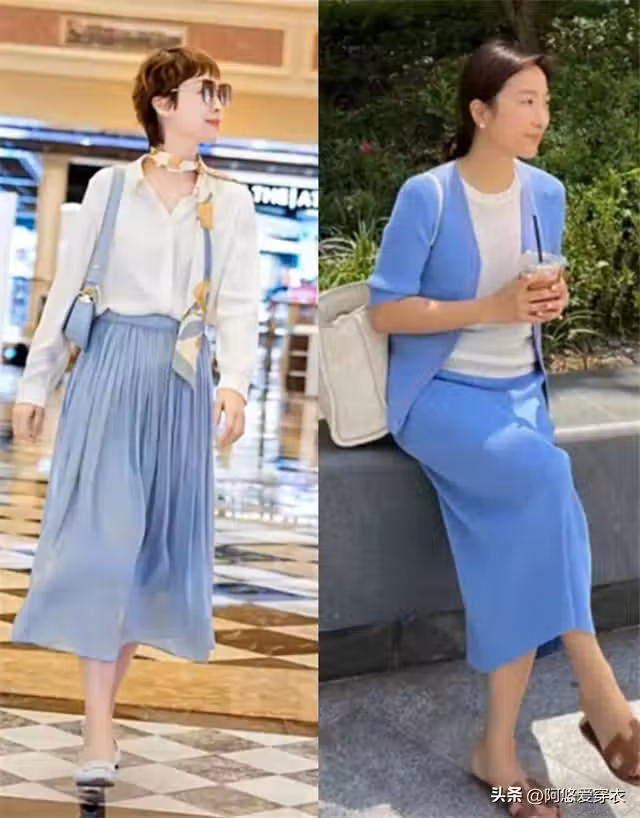 年齡大的女性最忌諱的就是全身搭配的顏色花哨艷麗,太俗氣,產生廉價感,最好在搭配的時候保證整個造型顏色不超過三種,這樣的話會顯得整體更簡潔利落,就像這些女性,她們更青睞於純色系的單品,在搭配時配合小面積的有設計感的彩色服飾來形成對比,避免穿得複雜繁瑣。