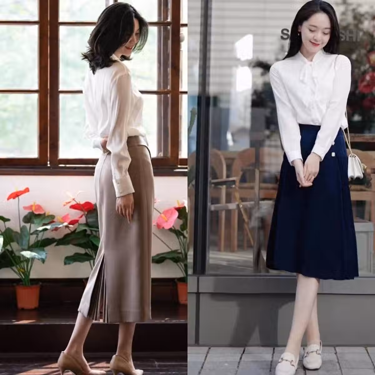 而相對日常一些的穿法,則是將上衣的下擺塞進裙腰當中,這種穿法能夠讓造型看上去更加的利落,即使上衣十分的寬松,也不會有臃腫感。
