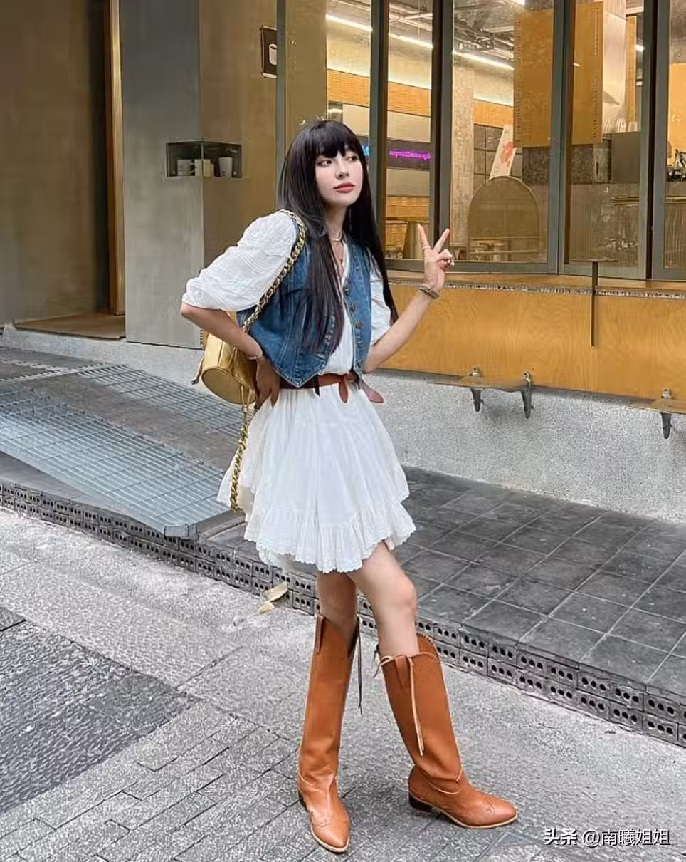 尤其是對於很多小腿比較粗的姐妹來說,一定要來嘗試一下牛仔靴,就算高度不超過膝蓋,也能很好的隱藏住腿型短板,在搭配上收腰款式的短裙,露出一截大腿線條更迷人。
