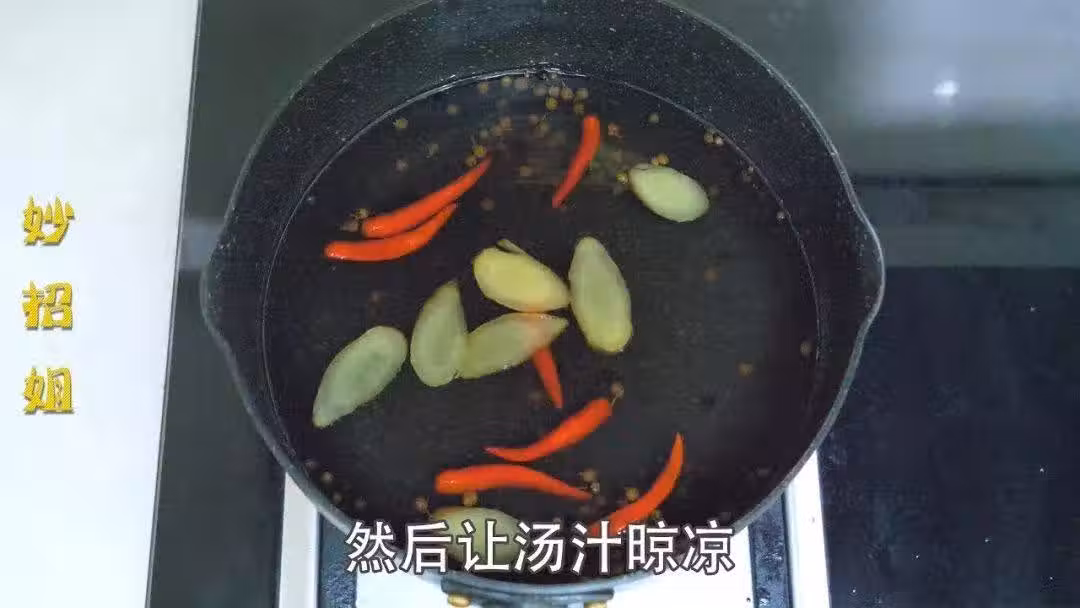 現在我們再來準備一個干凈的玻璃容器或瓷器,然後將晾涼的捲心菜和胡蘿卜放進去,接著再把晾涼的湯汁倒進去