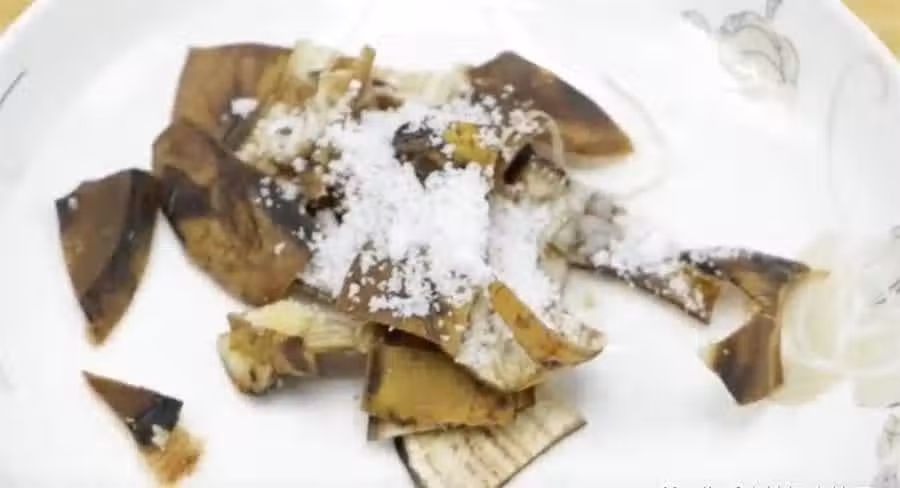 我們需要用到家裡面吃剩下的這種香蕉皮,我們將香蕉皮剪斷在盤子裡面下,然後往裡面放上一勺白糖。