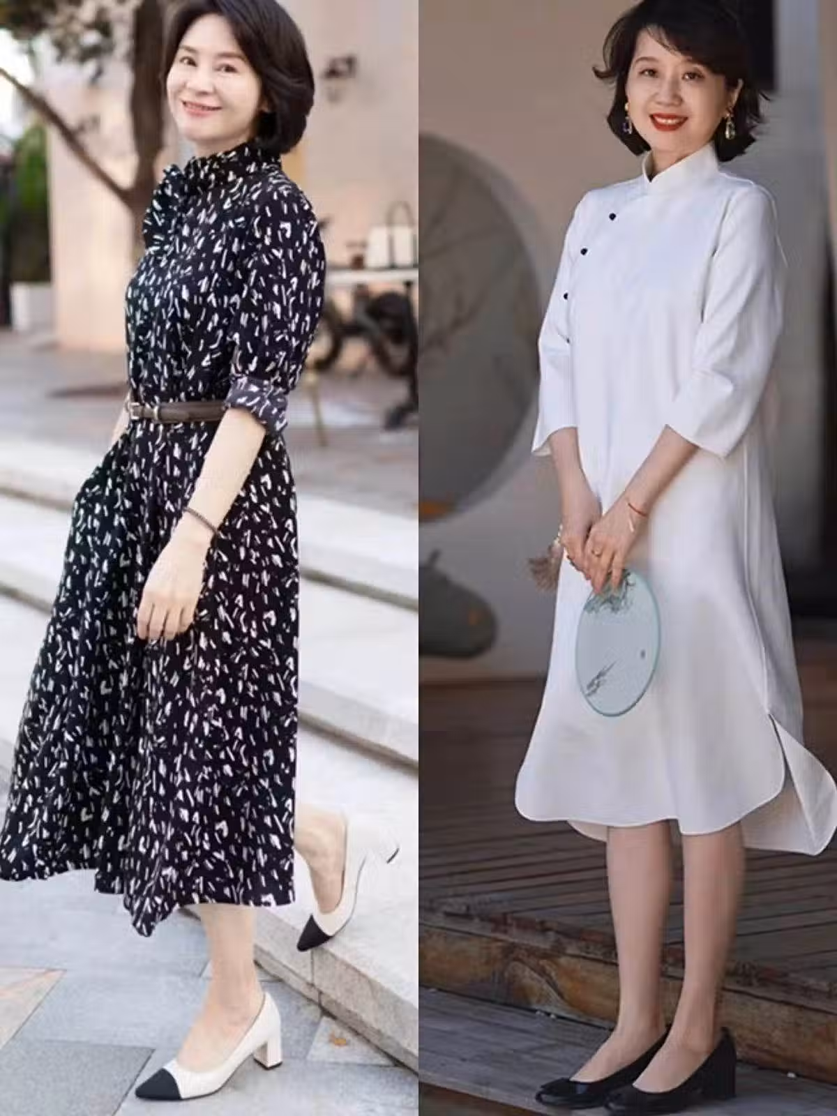 50歲女人實在不適合穿蕾絲裙或者大媽裙,上面這類清新素雅的小碎花裙,或者中式連衣長裙,都很貼合50歲女人優雅端莊的氣質,搭配奶奶鞋,舒適又高貴。