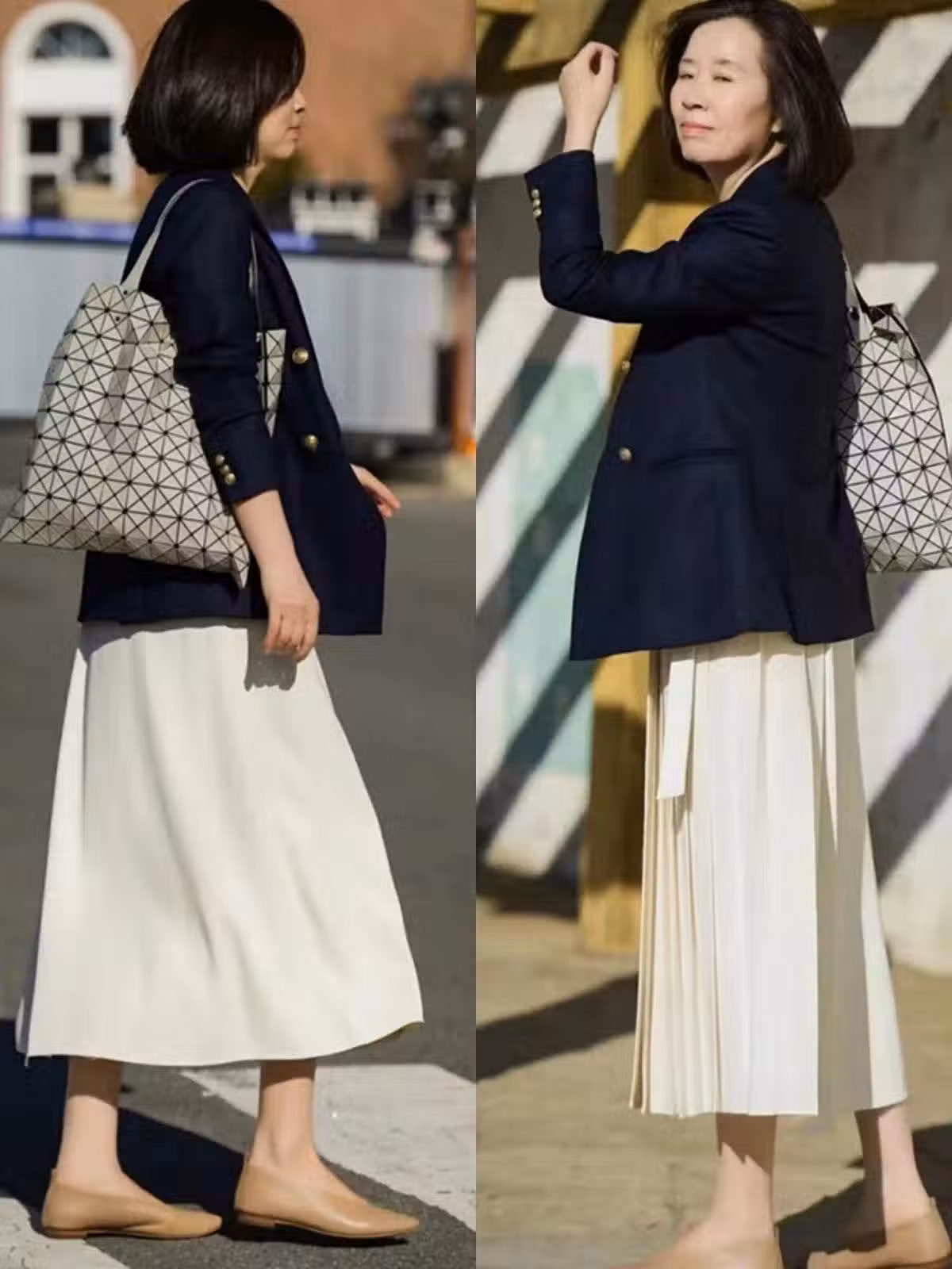 上了年紀的女人,用短外套+過膝裙打造春夏look時,需要關注鞋子的款式,盡量用皮質鞋子取代塑料涼鞋。