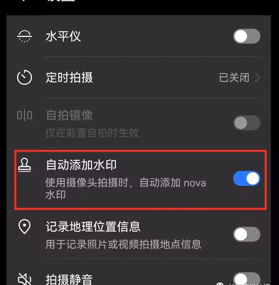 方法很簡單,同樣的打開相機功能後,點擊右上角的設置,然後一直往下翻,找到自動添加水印和記錄地理位置信息。將這兩個功能後面的開關都給它打開來,這樣我們在拍照的時候,它就會自動添加上時間、地點以及手機型號的水印了。