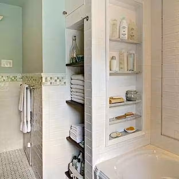 為了拿放方便,壁龕的高度需要注意,一樣要在人可以順手拿夠得著的地方。還有就是為了方便清潔,深度需要控制在10-20公分左右。衛生間用瓷磚鑲嵌的壁龕,四框盡量額[色.圖]45度碰角設計,不要用陽角裝飾條封邊,這樣才能裝修出一個更美的壁龕空間。