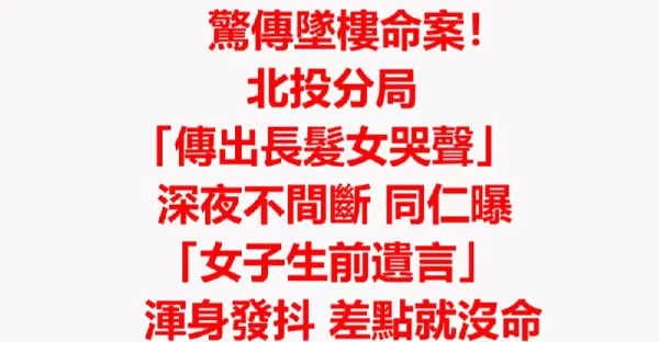 驚傳墜樓命案!北投分局「傳出長發女哭聲」深夜不間斷 同仁曝「女子生前遺言」渾身發抖:差點就沒命