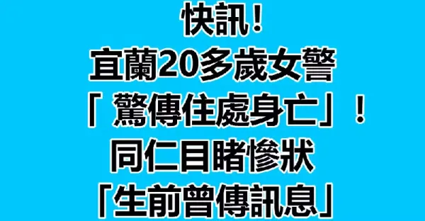 快訊/宜蘭20多歲女警「驚傳住處身亡」!同仁目睹慘狀:「生前曾傳訊息」