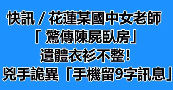 快訊/花蓮某國中女老師「驚傳陳屍臥房」遺體衣衫不整!兇手詭異「手機留9字訊息」